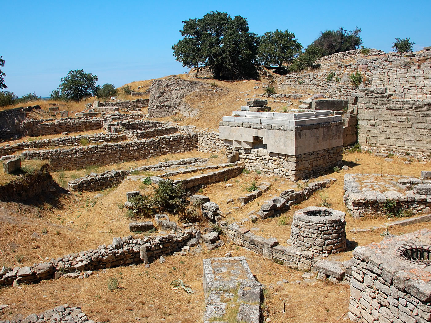 The Trojan Horse which was used in the movie Troy, The Trojan Horse (Did it really exist ?), Helen of Troy (Was she the real cause of the war ?), The Trojan Wars, Battle between Achilles an Hector, The 3200 years old city walls of Troy VI and VII, The East gate of VI (VIP entrance of Troy VI), The Temple of Athena, Walls of Troy II and Megaron House, Walls of Troy I (The oldest ruins of Troy), The trench of Schliemann, The ramp of Troy II, The Scaean Gate, The Gate of Troy VI (Where possibly the tricky wooden horse was taken), Sanctuary (Sacrificing Altars), Roman Bath, Odeon (Music theatre), South gate of Troy VI, Bouleuterion, Ruins of agora (Market place),